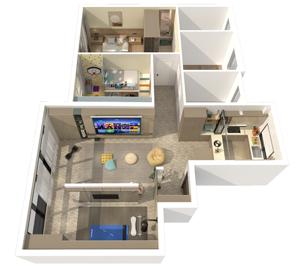 The design concept of "Rhythm" significantly enhances the flexibility of each space, adding to the child's sense of fun and providing ample room for learning and growth. Additionally, the use of multi-functional cabinets helps alleviate most of the storage pressure at home, allowing for more space to be transformed into areas where children can freely play.